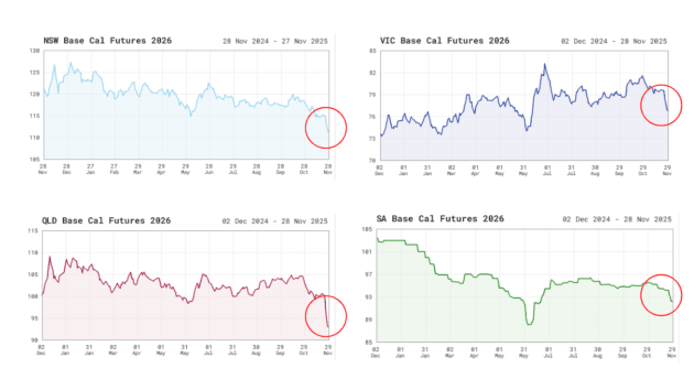 Historically, energy costs usually climb as we move into the warmer months, but right now, wholesale pricing has taken an unexpected dip across all states, but especially in NSW and Queensland. NSW has seen reductions of around seven per cent, and Queensland prices have dropped by roughly 10 per cent.