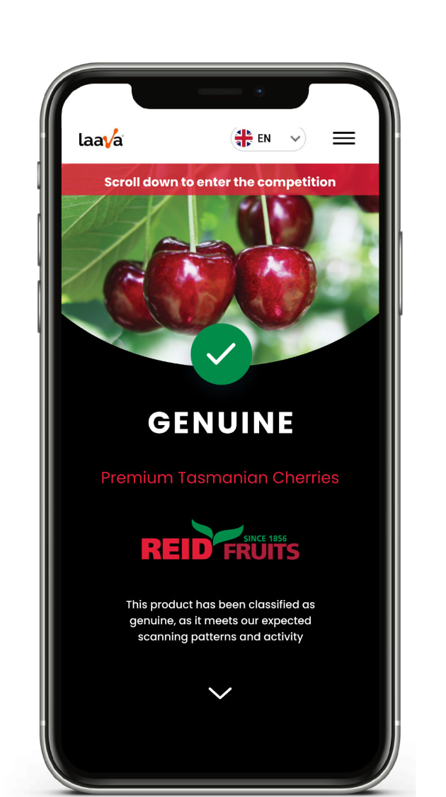 When a counterfeit Reid Fruits cherry box featuring a counterfeited Laava Smart Fingerprint is scanned by the consumer, a ‘Suspected Counterfeit’ message will be displayed on the consumer’s Smartphone screen, alerting them to the product not being authentic, along with support information from Reid Fruits.