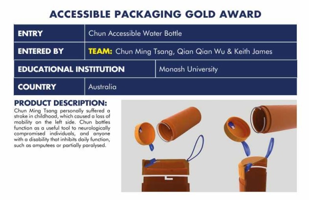 • Gold winner from Monash University: Chun Accessible Water bottle