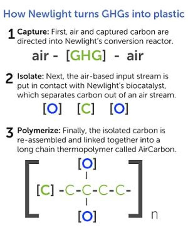 Newlight uses a biocatalyst to process the gases in a reactor, where the carbon is then pulled out and rearranged into plastic polymers that can be used to make bags or other materials. The catalysts used with AirCarbon are 10 times more efficient than other solutions, making it an economic choice that is also carbon-negative (stores more carbon in the plastic than it generates during production) with no reduction in performance compared to traditional plastics.