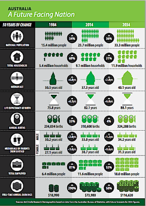 Australia has changed in the last twenty years. Our population is older. We’ve added 6.8 years to our median age and 6.3 years to our life expectancy already. And there are eight million more of us. Household structures are changing. Marriages and births take place later and more babies are born than ever before. We are becoming increasingly sophisticated, have access to infinitely more information and are growing new expectations because of this.