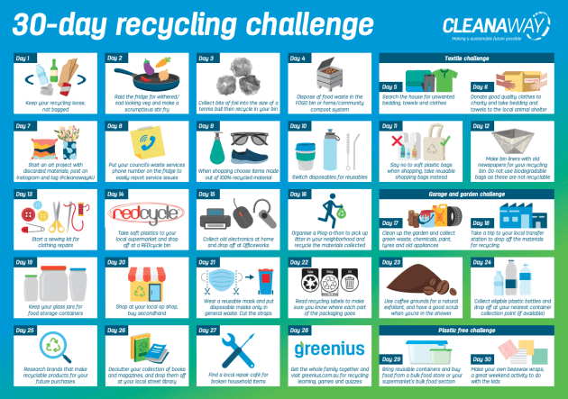 For National Recycling Week, Cleanaway is challenging Australians to take part in its 30-day recycling challenge, which is a calendar of daily recycling activities with bonus weekend challenges.